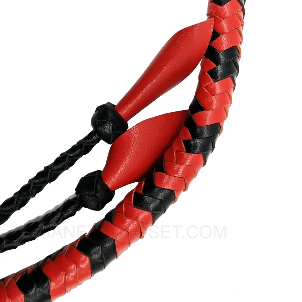 Command attention with every crack of this hand-braided leather bull whip, expertly crafted for both precision and punishment. Featuring a sleek black and red woven design, this whip is as visually striking as it is brutally effective.