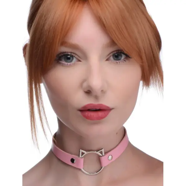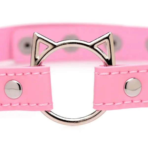 Slim Kinky Kitty Ring Choker – Pink PU Leather Cat Play Collar with Snap Closure