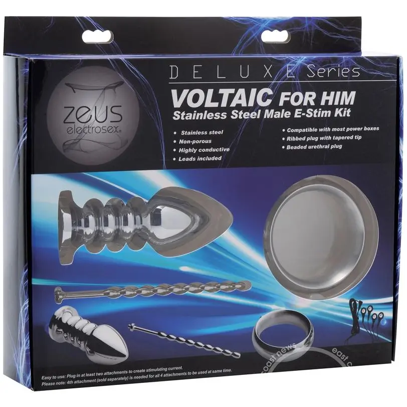 The Voltaic Male E-Stim Kit delivers a full spectrum of electro play sensations straight to your cock, balls, shaft, and hole. Designed for serious stimulation, this stainless steel set includes three premium attachments: a beaded urethral sound, a ribbed anal plug, and a solid cock ring—all compatible with Zeus E-Stim Power Boxes. Two contact points are required for bipolar stimulation, but with the included four-lead set, you can activate them all at once for a fully charged experience. Whether you’re dominating a submissive or pushing your own limits, this kit is engineered for precision, power, and unforgettable pleasure.